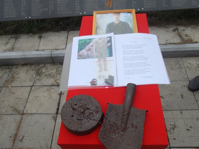 - 4 мая текущего года во время полевых раскопок примерно на глубине полуметра наши поисковики Александр и Антон Рудаковы обнаружили останки двух солдат, а рядом с ними их личные вещи. У одного солдата нашли портмане, в котором находились солдатский медальон и записная книжка, - рассказывает командир отряда Роман Миронов. – Медальон с его содержимым бал передан на экспертизу. Было установлено, что красноармеец Константин Сергеевич Девяткин погиб во время наступления 181 стрелковой дивизии от села Никольского в направлении на Муравль и Рудово 15 июля 1943 года. Сегодня мы передаем родственникам медальон, автоматный диск, саперную лопату, красноармейскую звездочку, записную книжку, найденные при погибшем.