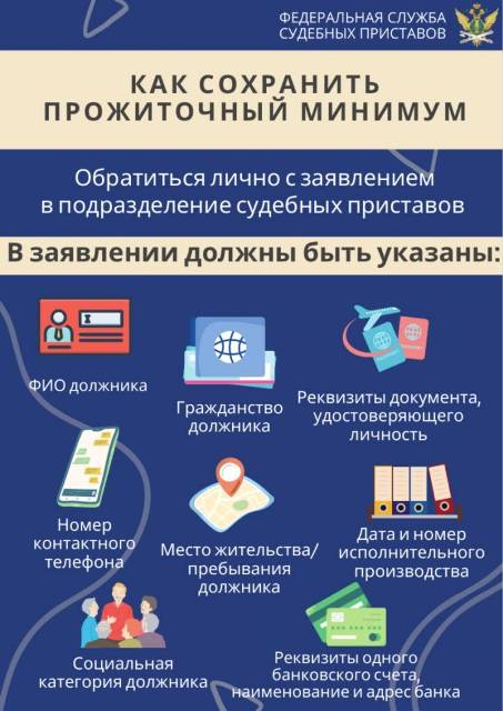 Граждане-должники вправе подать заявление о сохранении прожиточного минимума и неприкосновенности части денежных средств в рамках исполнительного производства через портал "Госуслуги". Обращаем внимание жителей региона, что минимальная сумма сохраняется только по запросу самого должника. Заполнить заявление можно как на портале «Госуслуги», так и самостоятельно, представив письменное обращение в структурное отделение судебных приставов, где ведется исполнительное производство.